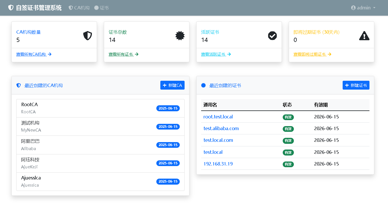 /: 仪表盘/login,/logout: 认证相关/register: 用户注册/cas: CA管理/certificates: 证书管理/download/<filename>: 文件下载