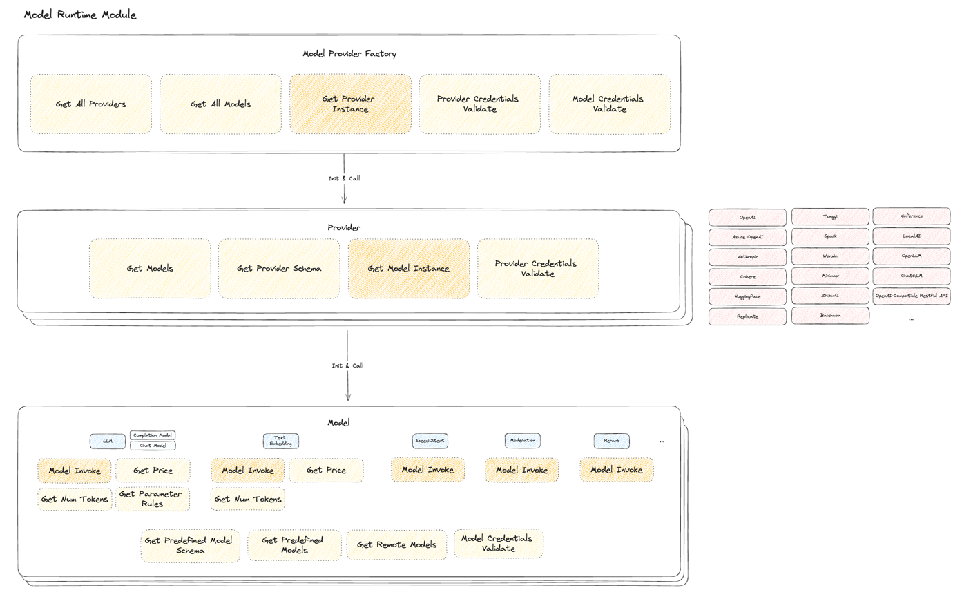 提供各种模型类型的直接调用、预定义模型配置信息、获取预定义/远程模型列表、模型凭据鉴权方法,不同模型额外提供了特殊方法,如 LLM 提供预计算 tokens 方法、获取费用信息方法等,可横向扩展同供应商下不同的模型(支持的模型类型下)。