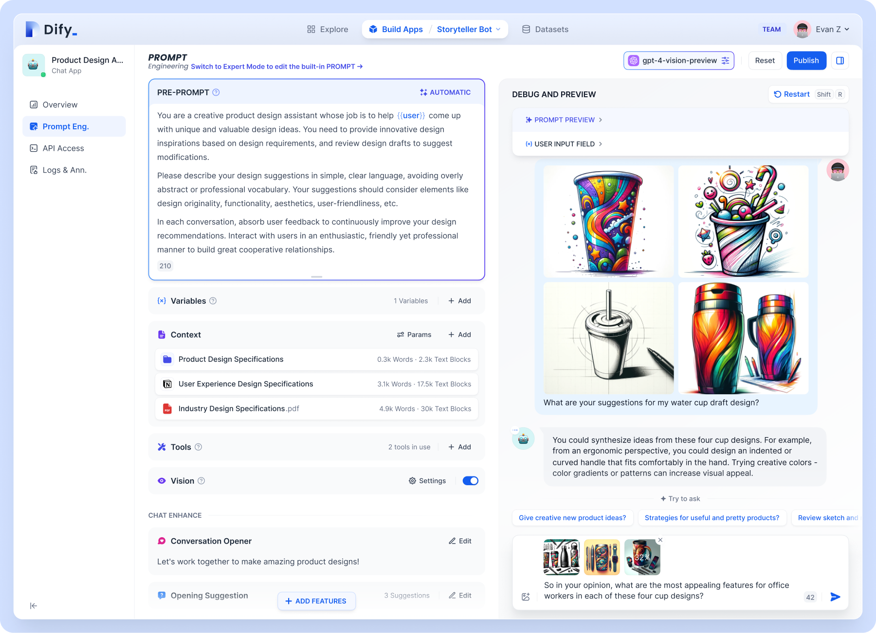 2. Prompt IDE:和团队一起在 Dify 协作,通过可视化的 Prompt 和应用编排工具开发 AI 应用。 支持无缝切换多种大型语言模型。